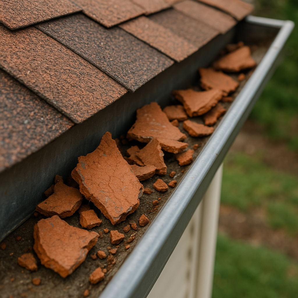 Finding roof pieces in your rain gutters means your roof is degrading and needs replacing soon.